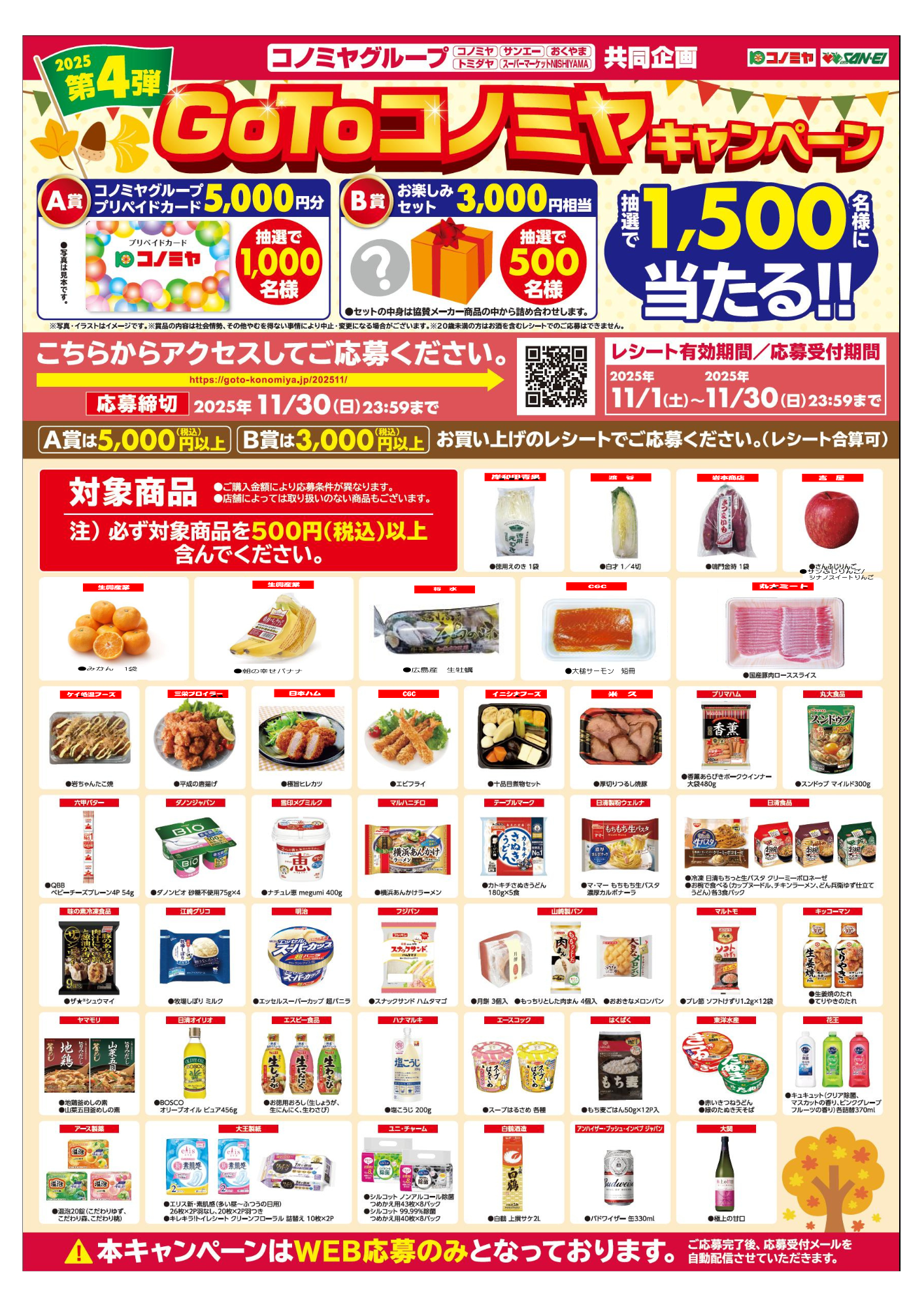 ・B賞(お楽しみセット)またはC賞(酒類詰め合わせセット)に応募する場合: 3,000円(税込)以上のお買い上げレシート 。